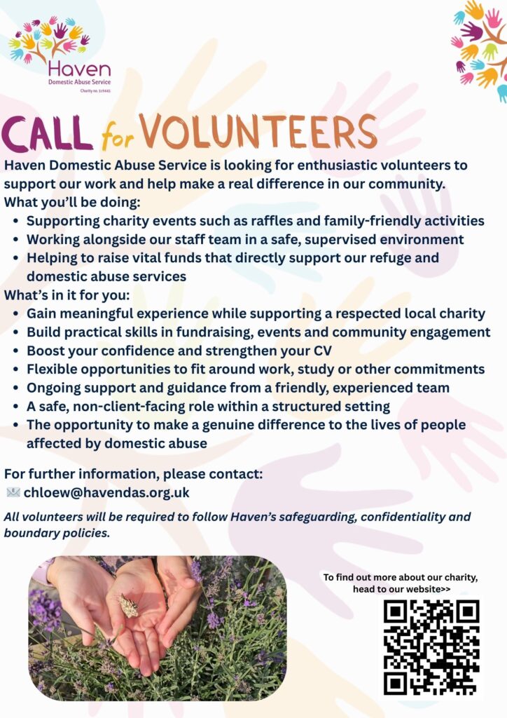 Haven Domestic Abuse Service are looking for enthusiastic volunteers to help support our work, make a real difference in the community and gain new experiences and skills along the way. Whether you’re looking to give back, learn something new or just get involved!